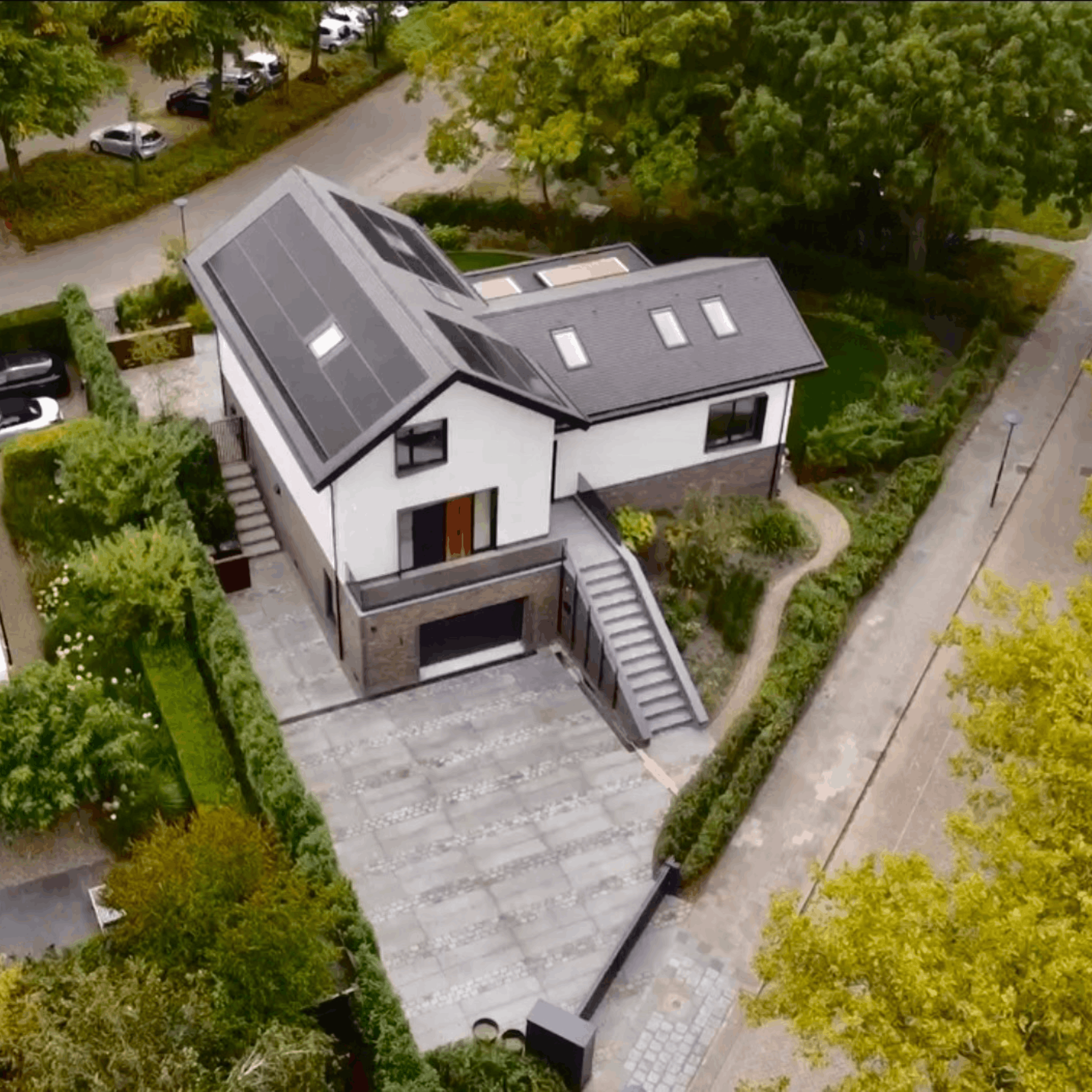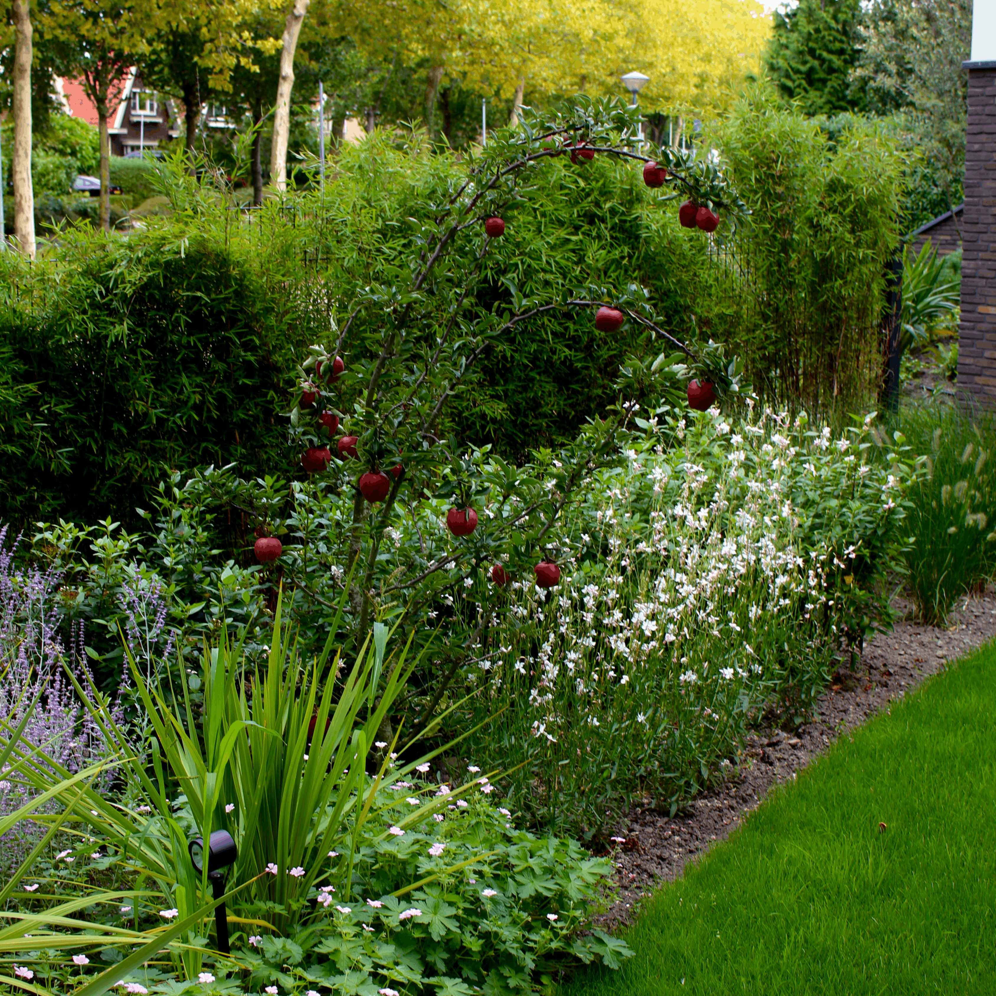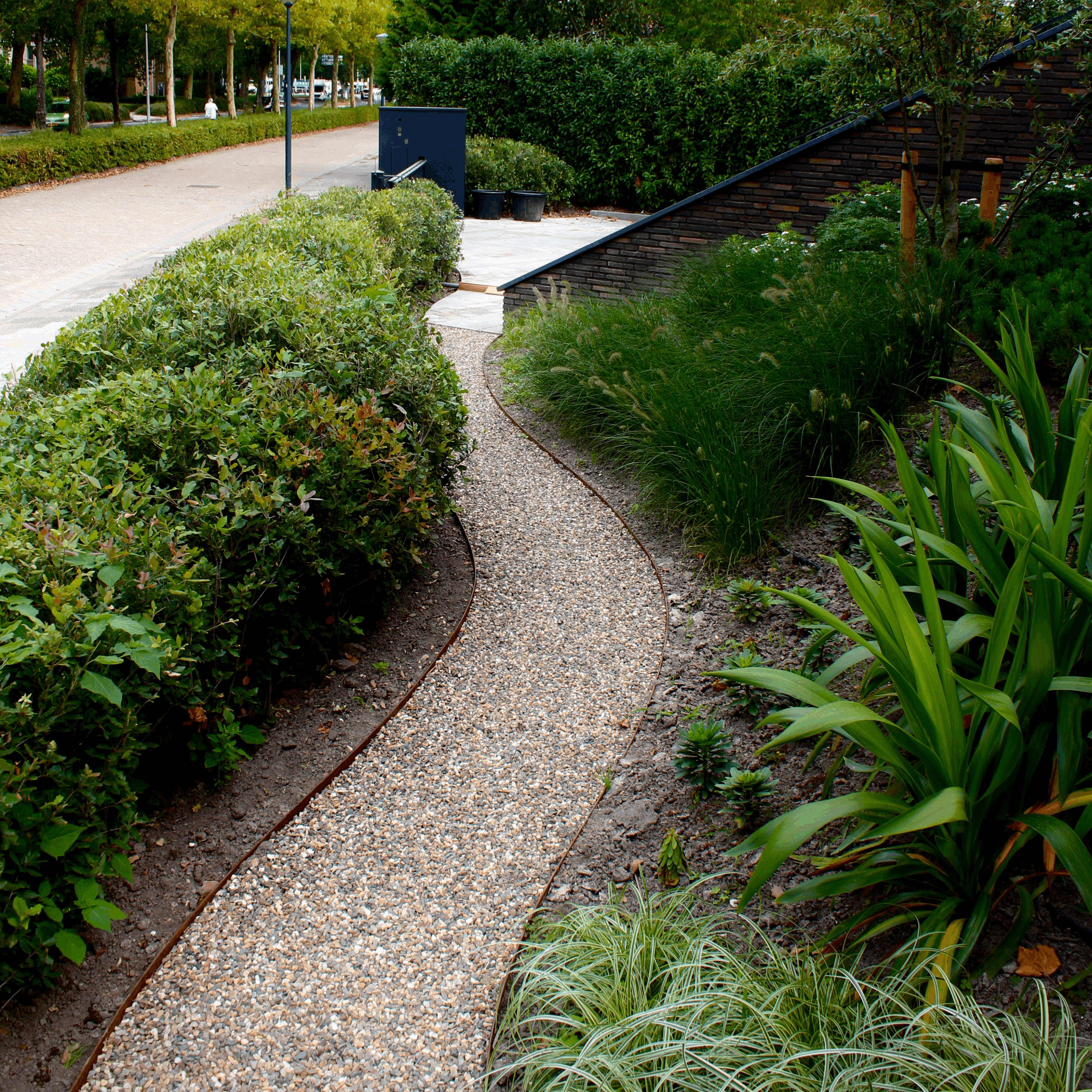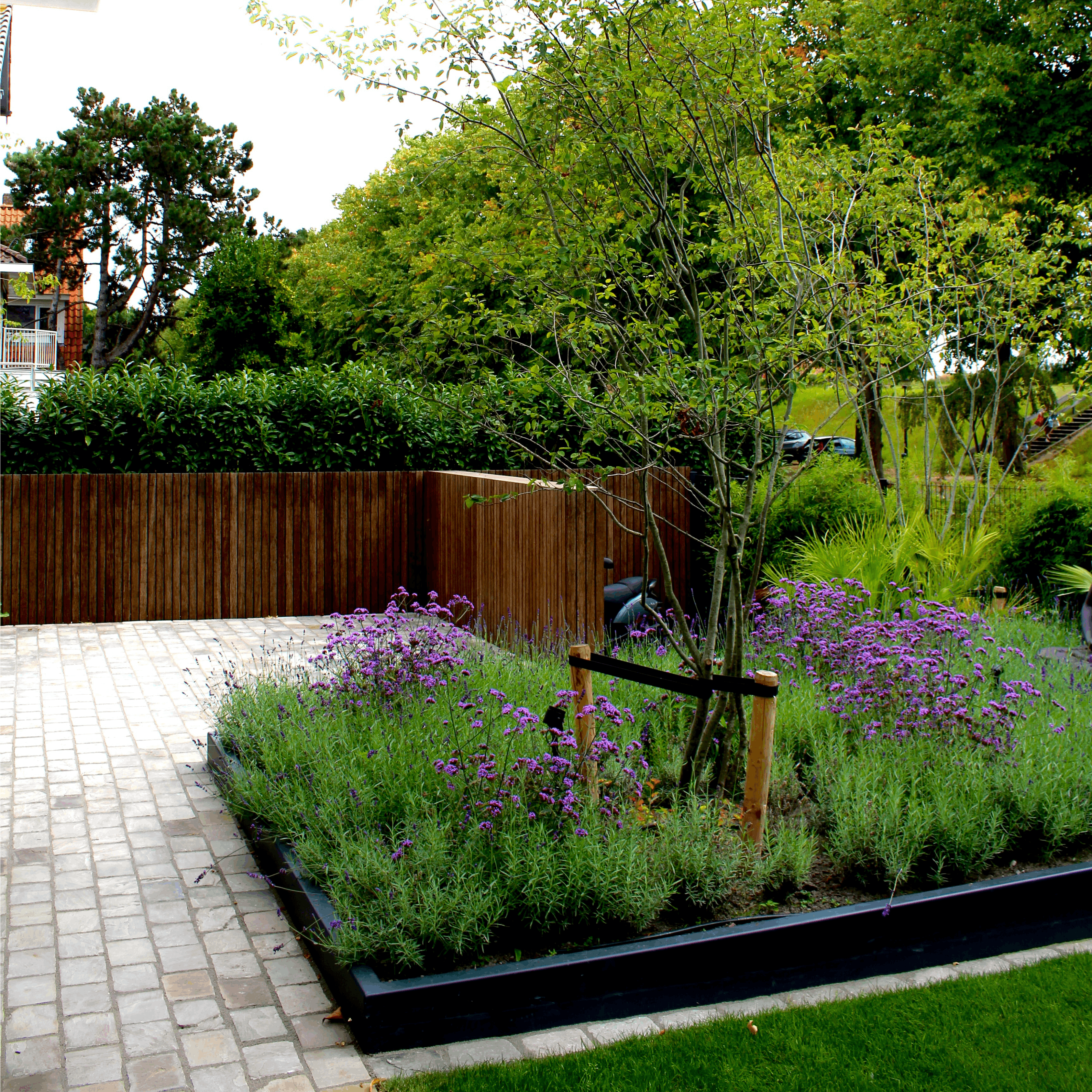 Een ruimtelijke tuin rondom het huis, precies op de grens van stad en stilte. Strakke lijnen leiden je langs verschillende sferen, waar beplanting en materialen zorgvuldig zijn gecombineerd. Een tuin waarnaar toch nog even naar om wordt gekeken wanneer u het perceel verlaat.